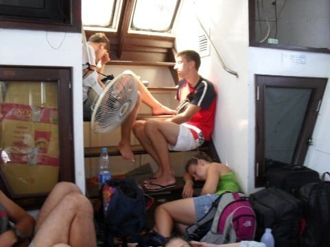 Pendant que certains touristes étaient en train de se faire pigeonner des forfaits de plongée sous marine à 4/5 fois le prix habituel, d’autres essayaient de dormir là où ils pouvaient après une nuit festive à Haad Rin (plage de la full moon party). Pour avoir une place assise à l’intérieur du bateau, il fallait monter avant les autres et directement descendre, sinon vous aurez au mieux une place par terre ou dans les escaliers pour rester à l’ombre.
